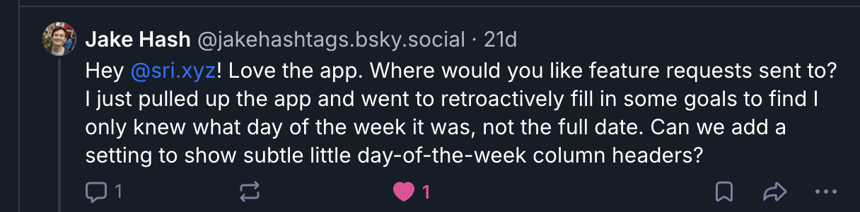 I'm still working out the best UX for weekly and monthly goals. Since the site is completely based on the everyday goal calendar, this needs some extra thought.