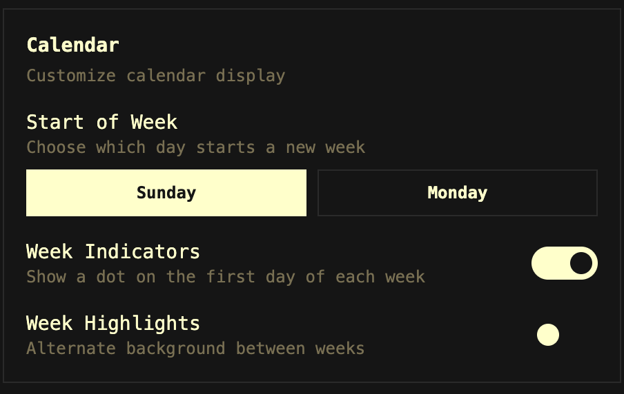 Alternating week highlights - Some shape/color combos look better without them. Toggle on/off in settings.
