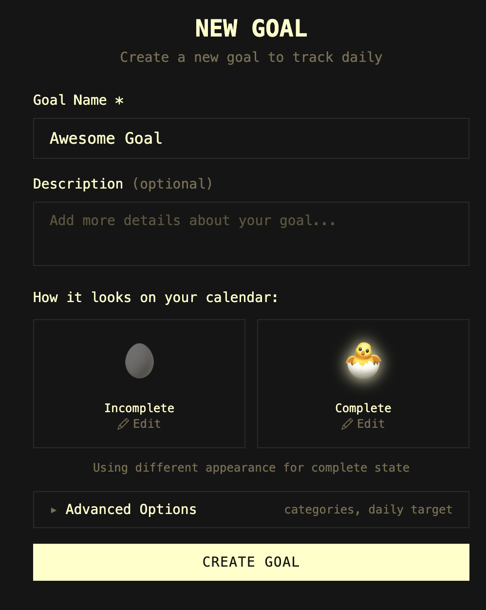 Mix and match shapes and emojis to define how incomplete and completed goals appear on your calendar. Lots of possibilities!