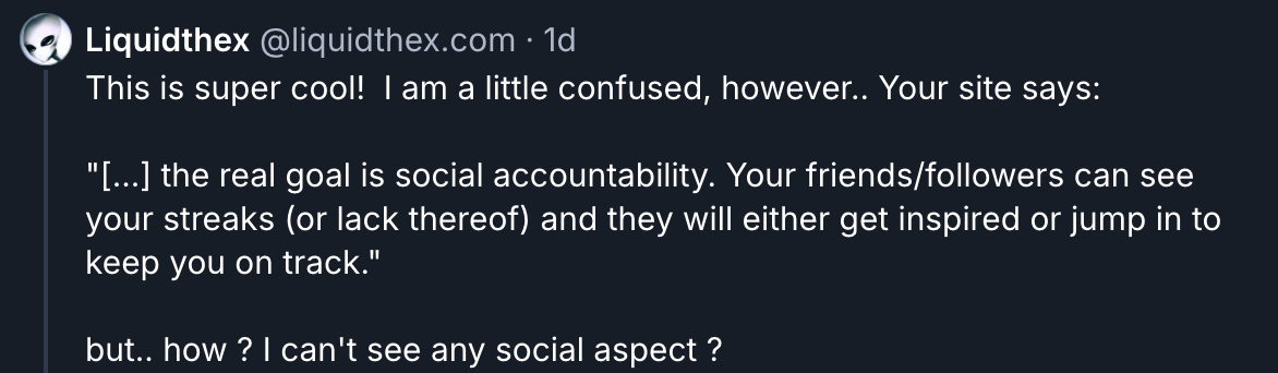 Haven't cracked the group/community goals, automated goal completions or the social accountability features. More to come as I prototype these.